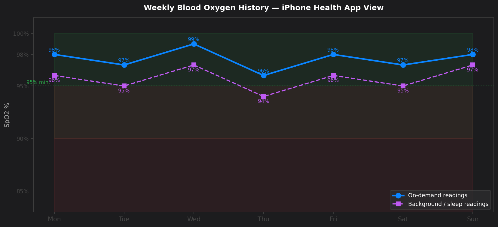 Enable background monitoring and review your weekly average in the Health app rather than fixating on any single reading. A week of data showing consistent 97% to 99% averages is far more health-meaningful than any individual measurement. The trend is the health signal; individual readings are just noisy data points.