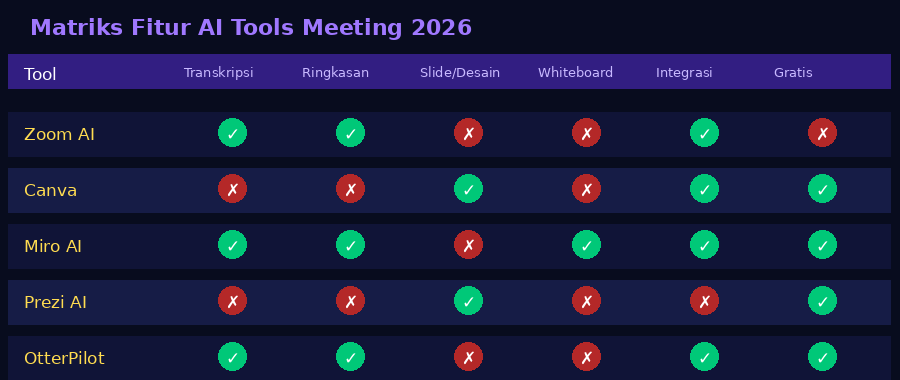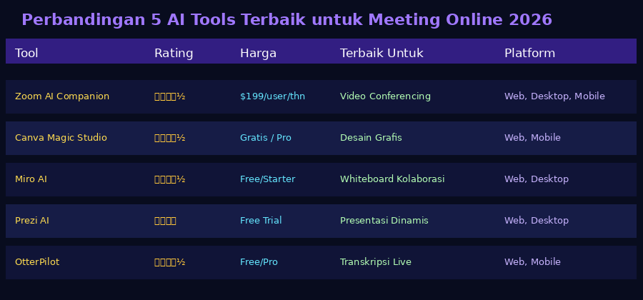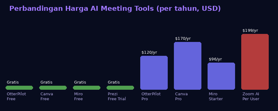 Dari sisi harga, lanskap AI meeting tools 2026 sangat menggembirakan karena hampir semua menawarkan opsi gratis yang cukup fungsional. Canva, Miro, Prezi, dan OtterPilot semuanya memiliki tier gratis yang memberikan akses ke fitur-fitur inti ideal untuk individu atau tim kecil yang ingin mencoba sebelum berkomitmen pada langganan berbayar.