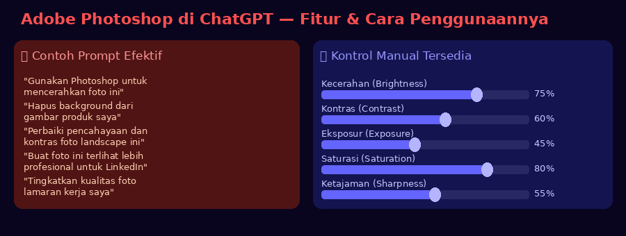 Contoh prompt efektif untuk Photoshop di ChatGPT (kiri) dan kontrol slider manual yang tersedia (kanan)