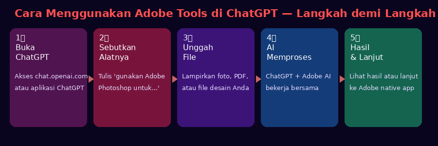 Alur kerja penggunaan Adobe tools di ChatGPT — dari membuka chat hingga melanjutkan ke aplikasi native