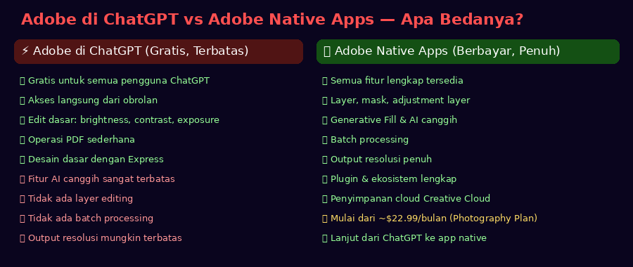 Perbandingan fitur Adobe di ChatGPT (gratis, terbatas) vs. Adobe Native Apps (berbayar, penuh)