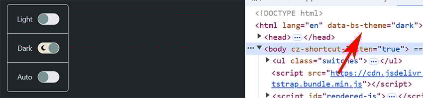Bootstrap 5.3 memperkenalkan solusi yang jauh lebih rapi melalui color modes, yang bekerja menggunakan atribut HTML:
