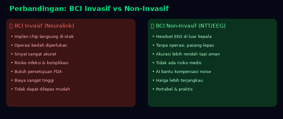 Perbandingan BCI invasif (Neuralink) vs. non-invasif (NTT/EEG) — tradeoff antara akurasi dan keamanan