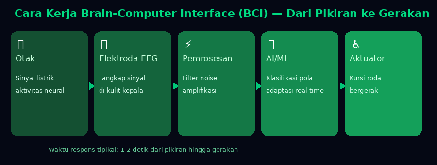 Alur kerja sistem Brain-Computer Interface: dari sinyal otak hingga gerakan fisik mesin