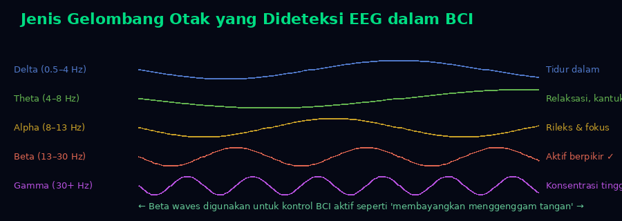 Jenis-jenis gelombang otak yang dideteksi EEG — gelombang Beta adalah kunci untuk BCI aktif