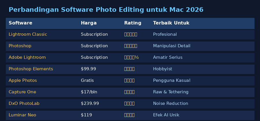 Perbandingan lengkap software photo editing terbaik untuk Mac 2026 berdasarkan rating dan harga