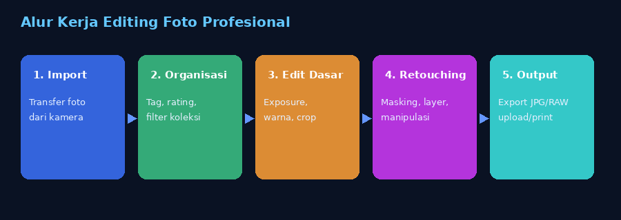 Diagram alur kerja editing foto profesional — dari impor hingga output akhir