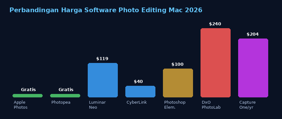 Grafik perbandingan harga software photo editing Mac 2026 — dari gratis hingga premium