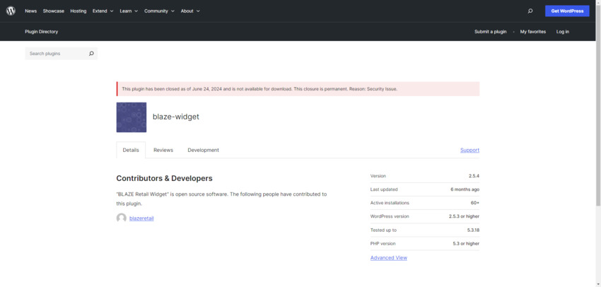 | June 24, 2024 | WordPress.org permanently removes Blaze Widget — 'Security Issue' closure |